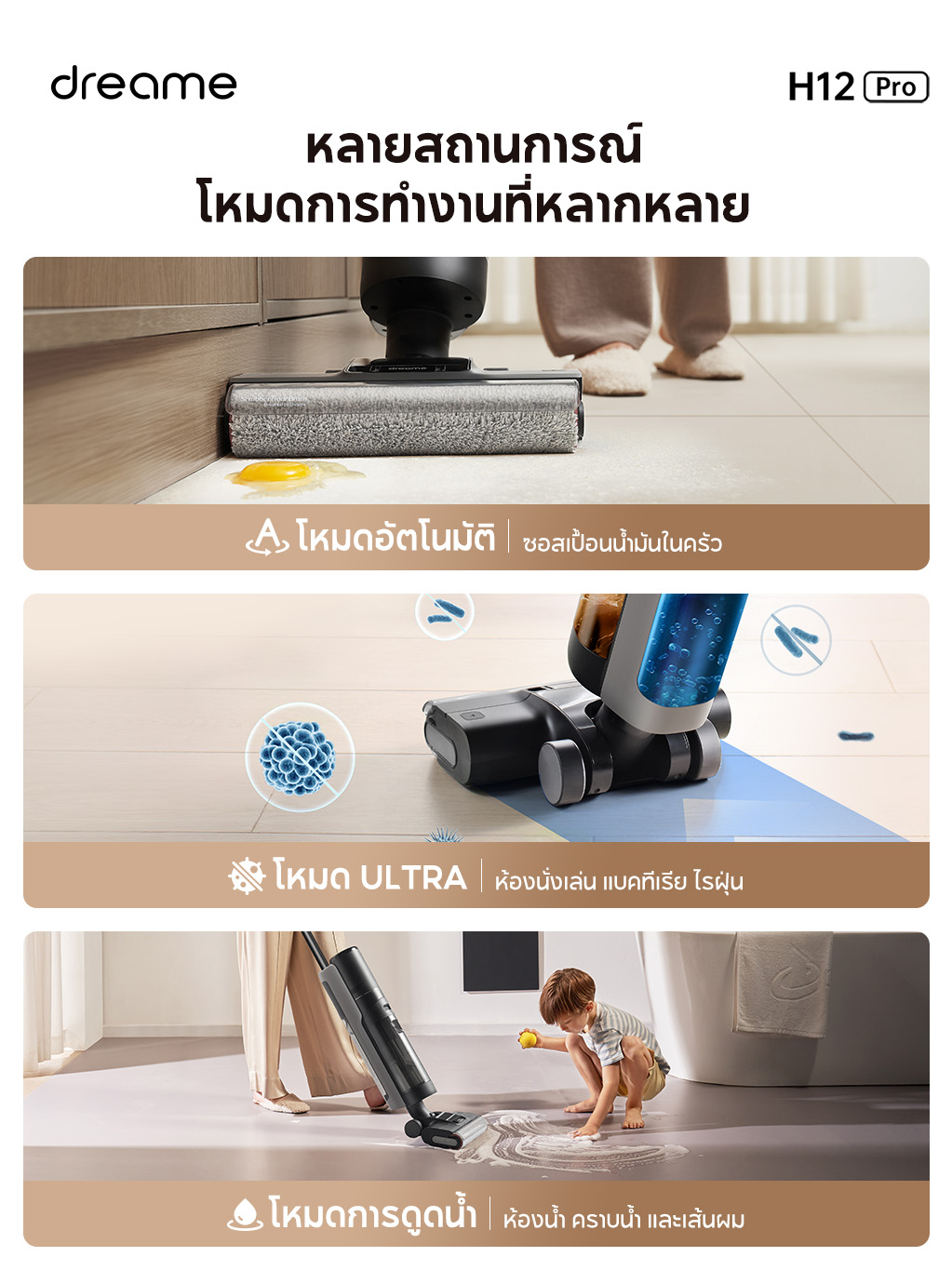 | -มี mode ในการทำความสะอาด 3 รูปแบบ Auto mode , Ultra mode และ Suction mode |