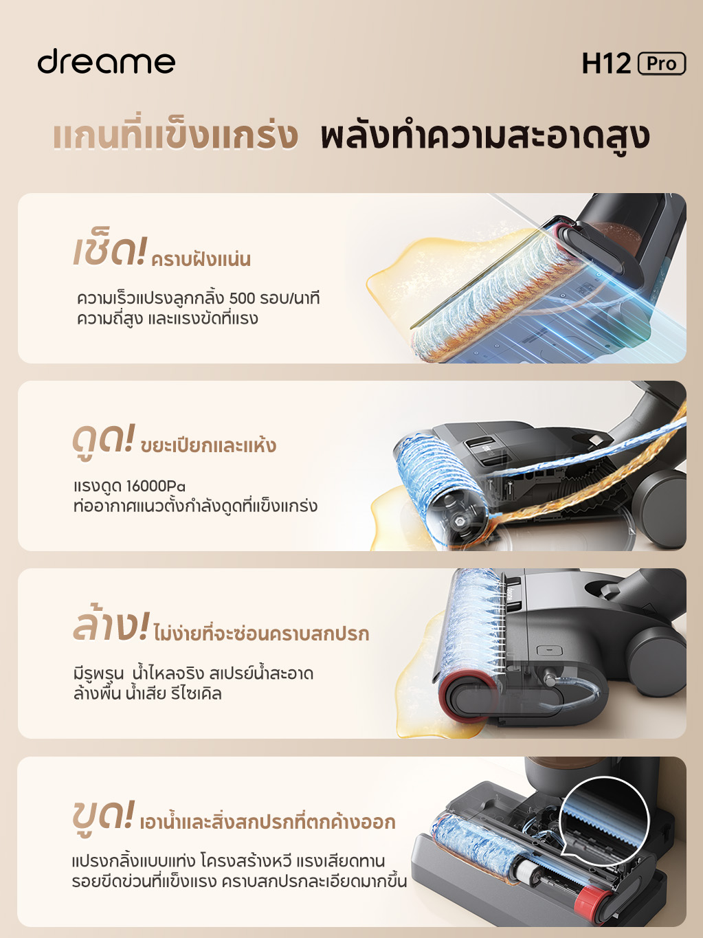 | -เครื่องดูดฝุ่นถูพื้นไร้สาย อัจฉริยะ สามารถซักแปรงถูพื้นและเป่าให้แห้งได้ด้วยลมร้อน หลังทำความสะอาดเสร็จ |